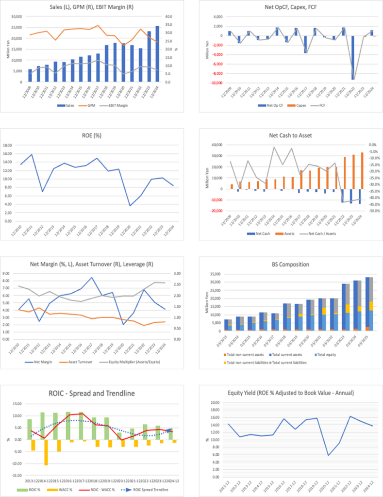 On supply and demand, prices and trading volume broke through key levels in tandem with the timing of Company announcements during April–August (full-year outlook, dividends, and medium-term plan revision), strengthening momentum. PBR remains in the 0.7x range, leaving a gap in which progress in evaluating shareholder measures and the upward revision of the medium-term plan exceed revaluation in terms of multiples. Going forward, (i) continuation of expanded purchases, (ii) maintenance of turnover and gross margin, and (iii) visualization of capital efficiency (ROE range) are seen as keys to making the scenario of PBR of 1.0x more realistic.