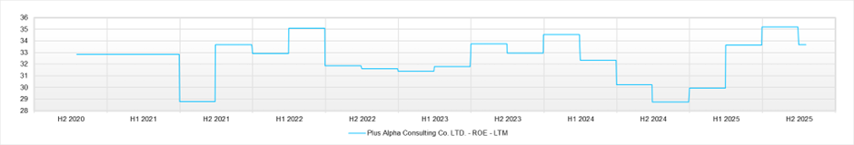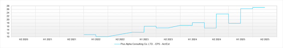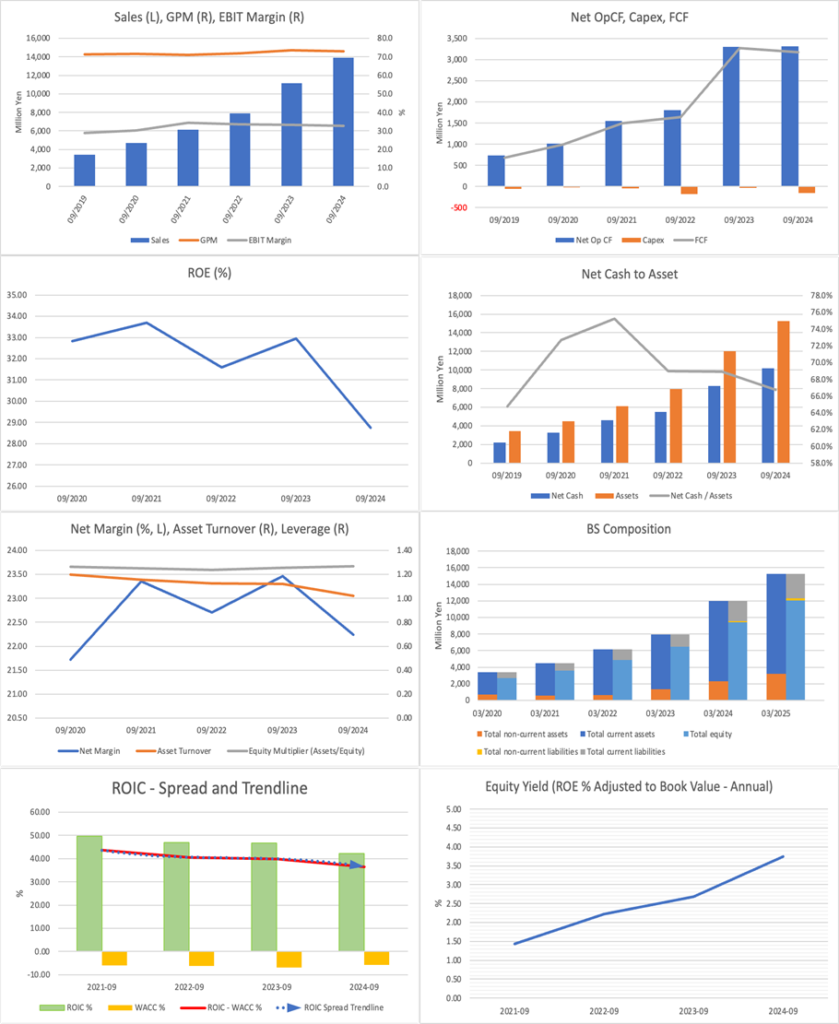 Top-line growth is firmly in high gear, and the combination of robust free-cash-flow generation with an asset-light balance sheet yields strikingly high returns on capital. The concurrent achievement of around +30% annual revenue growth and net profit margins in excess of 20% underpins this, warranting a premium valuation. Current valuation and forecasts (forecast PER 24.4x, actual PBR 8.42x, forecast ROE 36.1%, forecast EPS 97.5 yen, forecast dividend 29 yen) embed about 25% annualised EPS growth, consistent with a five-year EPS CAGR of +35% and the company’s forecast of +38% EPS increase in the current-year plan.