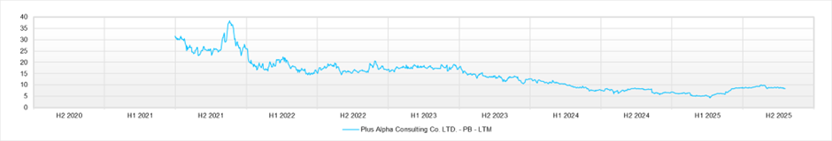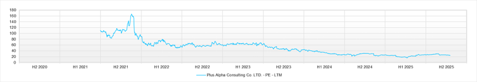 Although management has raised the payout-ratio guideline to 30%, it has not set out concrete uses for existing cash and future cash flows, leaving investor concerns unresolved. Net cash, which stood at 9.6 billion yen at end-3Q (June), increased further by 3.0 billion yen through the August disposal of treasury shares to Mynavi and is now estimated at roughly 12.6 billion yen, possibly accounting for about 72% of total assets; accordingly, the equity ratio should have risen from 78% to 82%, further skewing the balance sheet towards cash in the short term. For a growth company more than five years post-IPO, a cash-bloated balance sheet is, from an equity investor’s standpoint, evidence of inefficient capital deployment and invites doubts as to whether growth investment opportunities have been exhausted. That cash equates to only 12% of the market capitalisation, which is inflated by a high multiple, and a net-cash-adjusted PER of 22x is not cheap at all.