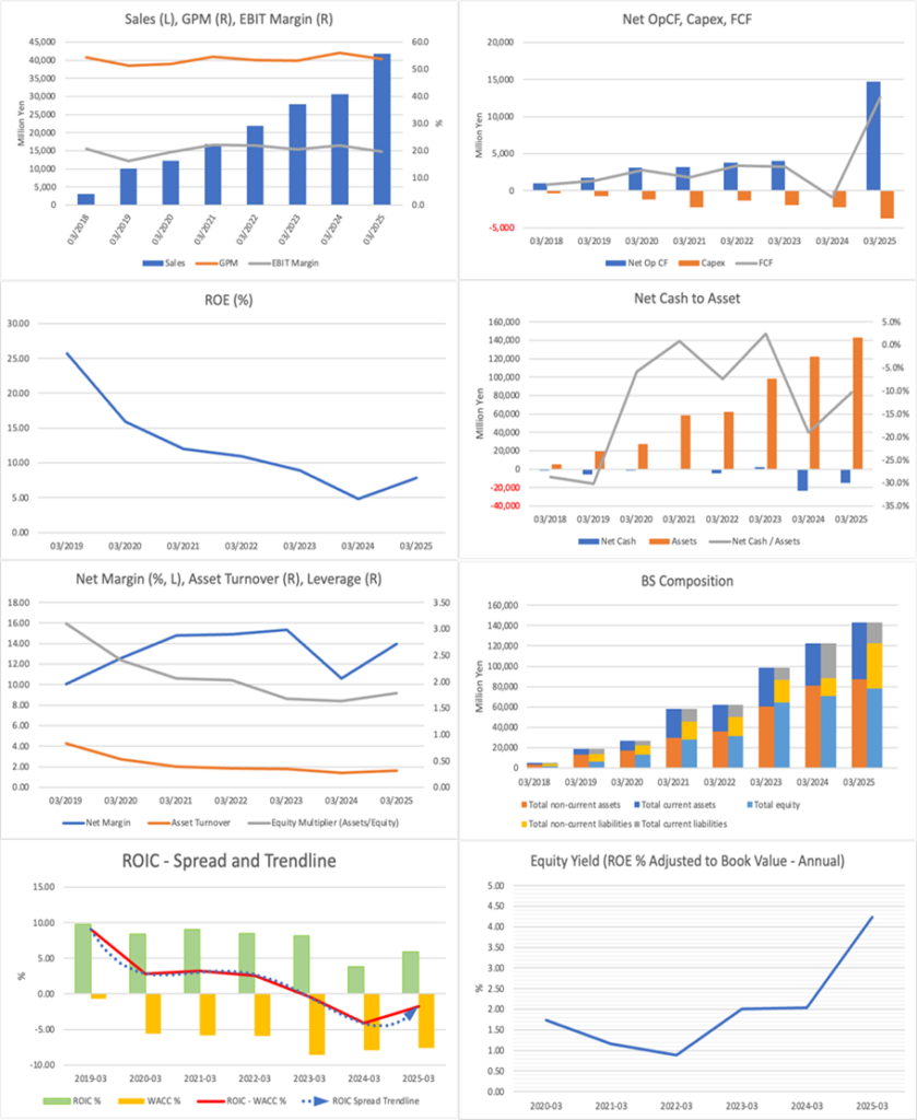 From a valuation perspective, based on assumptions of a forward PER of 37.6x, an actual PBR of 3.50x, a forecast ROE of 9.5%, forecast EPS of 113.2 yen, and a forecast dividend of 17 yen, we estimate that the medium- to long-term EPS growth rate implied by the market is roughly 8%. By contrast, the EPS CAGR over the past five years is +25%, and this gap is significant. In other words, the market takes a pretty sceptical view of the sustainability of the company’s high growth. Given the bloated balance sheet, negative economic value creation, and the unpredictability of impairment risk, the valuation is considered reasonable and demonstrates foresight. To raise our investment stance from “Avoid”, we require concrete signs of improvement in a healthier balance sheet, including goodwill, other intangible assets, and borrowings.