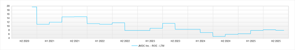 During this period, as corporate acquisitions have accelerated, goodwill has surged with a CAGR of +50% over the past five years and now accounts for around 40% of total assets. At the same time, amortisation expenses have also increased with a CAGR of +25%, reaching around 33% of operating profit and weighing on earnings. Interest-bearing debt has also built up significantly, and while ROE currently appears to be holding at a reasonable level of around 8%, economic profit, taking into account invested capital and the cost of capital, has fallen into negative territory.