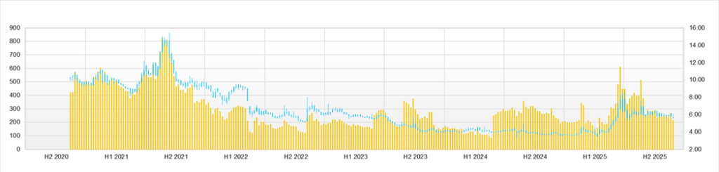 Looking at the share price trend over the past three months (August 19 to November 17), after opening at 300 yen, hitting a high of 302 yen, and closing at 284 yen on August 19, the share price moved into the 300 yen range. Still, on August 20, it fell sharply, with a high of 286 yen, a low of 247 yen, and a close of 247 yen (-13.03% from the previous day), and then shifted into a box range of 260–280 yen in September. In late September, the closing price occasionally returned to around 280 yen. However, in October, the share price temporarily fell back to 249 yen, and from October 1 to November 14, 2025, the intraday range was 228–273 yen, with a closing price range of 231–263 yen. The share price thus still stands at an intermediate level, having risen substantially from the year-to-date low of 93 yen (April 7) yet remaining in a correction phase from the year-to-date high of 417 yen (June 25).