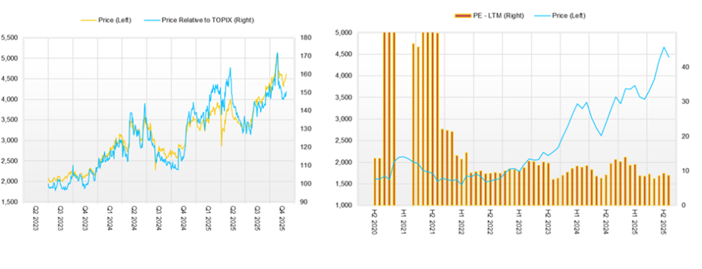 The Company’s stock price rose steadily after the announcement of the first-quarter results, reaching 5,220 yen on October 29, but then entered a period of adjustment to the 4,200-yen range. However, at present it is holding firm in the 4,500-yen range. Currently, PBR is above 1.0 times, while the forward PER remains at 8.8 times, and there is little sense of overheating in the stock price.