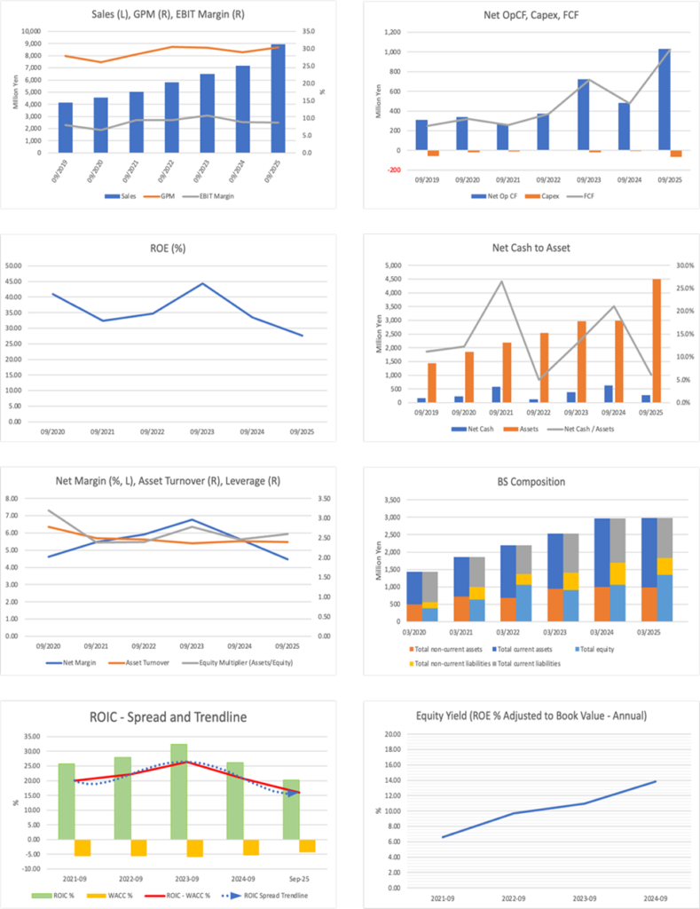 The plan for FY9/2026 may appear unsatisfactory if one looks only at short-term profit growth. Still, if the fiscal year is positioned as one for nurturing strategic domains, it is reasonable. Net sales are expected to maintain double-digit growth, EPS is projected to grow to 141 yen, and there is a strong likelihood that the high level of capital efficiency and cash generation capacity, with ROE around 28.1%, will be maintained. In the medium term, the key to revaluing the valuation multiple will be how much the sales and profits of the strategic domains can be increased, and to what extent the dividend payout ratio and the level of share buybacks approach market expectations.