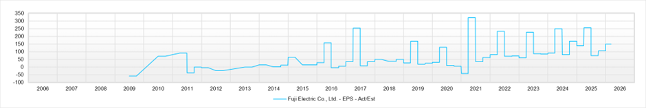 Overvalued. Fuji Electric’s long-standing improvement in EBIT margin since FY2009 has been impressive, and, in light of its ROE of around 10%, steadily growing top line, and decent cash flow, the company’s quality is highly rated. However, the current share price goes beyond assessing this stable earnings structure. It already reflects, to a considerable extent, the assumption that growth in energy, power-supply equipment for data centres, power-receiving and distribution equipment, and semiconductors will remain high going forward. The business quality is high, but the share price is even more bullish.