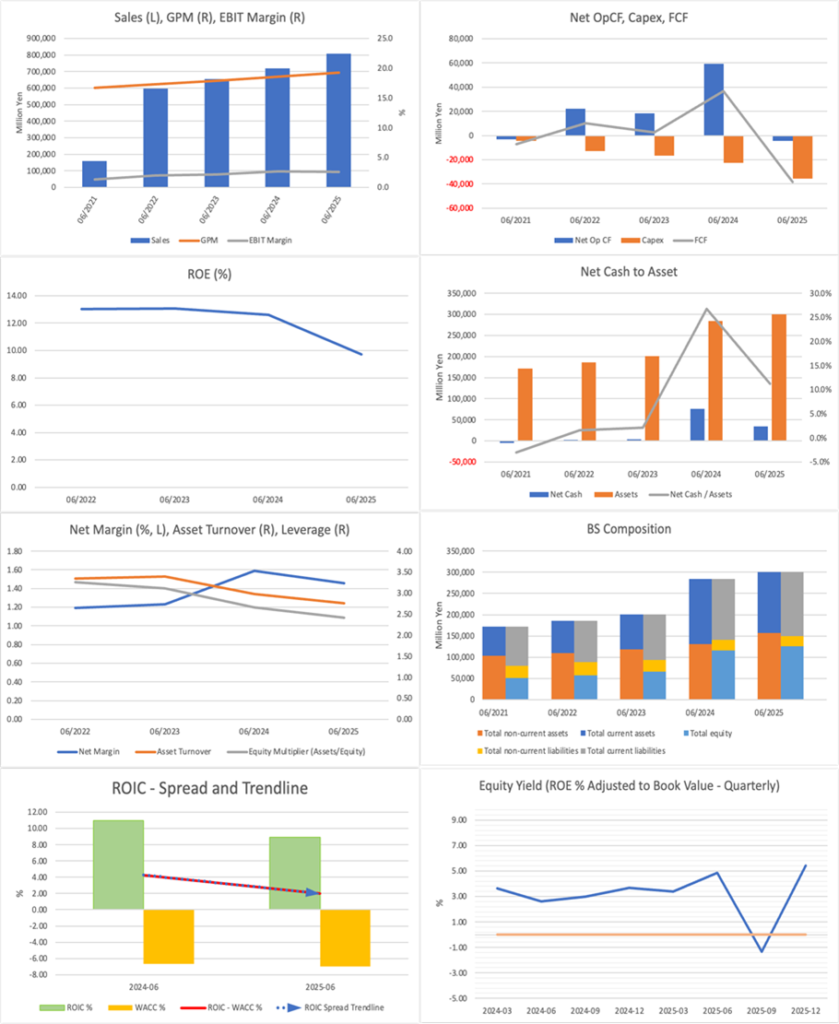 The company plans to target a net sales CAGR of +7% over the next three years, but an operating margin of 3.9% in FY06/2029 is not necessarily attractive. On the other hand, the target ROE of 16.5% does look attractive. However, compared with the period before the acquisition of Seiyu, this level presupposes a substantial use of financial leverage, and it would be difficult for investors to be fully convinced at this point. To calculate a more reliable fair value, there is no need to rely hastily on the figures presented in the company’s medium-term management plan; it is not too late to first confirm the financial figures in the 12-month results for FY06/2026.