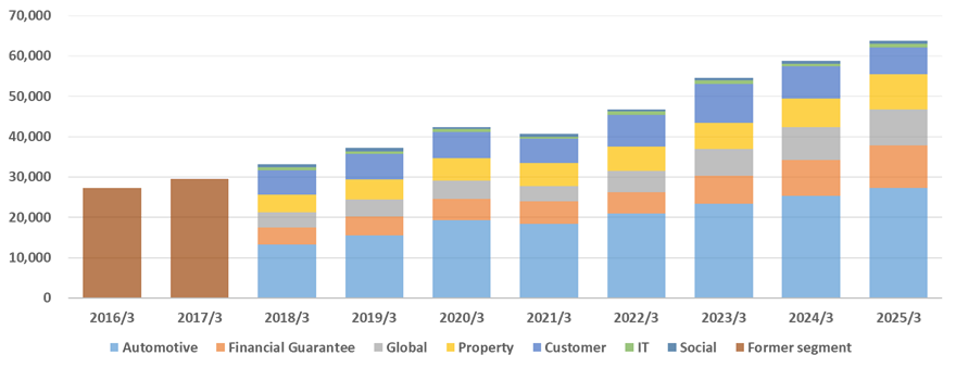 In FY3/2025, the sales mix by segment was 43% Automotive, 14% Property, 14% Global, 10% Customer, 17% Financial Guarantee, 1% IT, and 1% Social, with an overseas ratio of 7%.