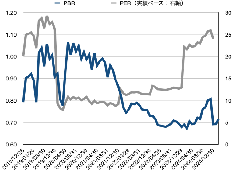 ◇株価動向:直近半年において株価は1,000〜1,200円で推移している。ドル円相場に連動する傾向が見られるが、円安が一服していることが足元の株価支援材料となっており、2024年12月期決算も大きなショック無くこなしている。黒字体質、健全財務、低PBR、4%台の配当利回り、ROE8%・PBR1倍達成に向けたコミットメント、自己株式取得などを株式市場が評価しているとみなせる。為替動向から目が離せないものの、諸施策の効果が財務数値により鮮明に現れ始めれば、PBR1倍を目指す展開になりうるだろう。