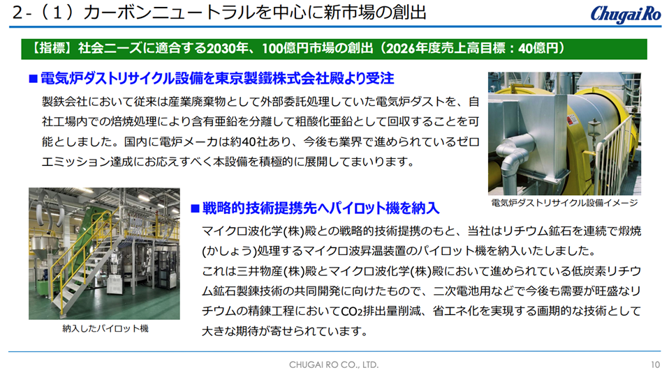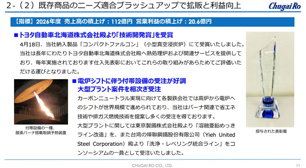 第一に、受注高、損益の質的充実。受注高は総じて順調に推移し、1計画を上回る模様だ。熱処理事業では国内自動車向け真空浸炭炉や住宅設備部材向け焼成炉、半導体関連の機能材熱処理炉などの成約を得ており、プラント事業では国内非鉄向け加熱炉や、海外鉄鋼向け加熱炉改造工事、プロセスライン洗浄装置などの成約を得た。なかでも、第1四半期でも取り上げた鉄鋼向け電気炉ダストリサイクル設備の受注は中期的に拡販が期待できる。