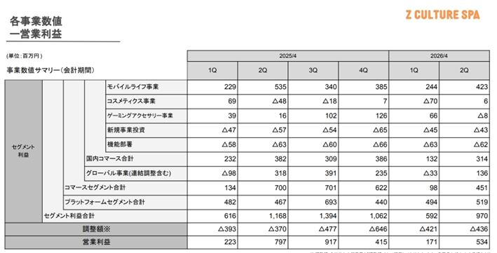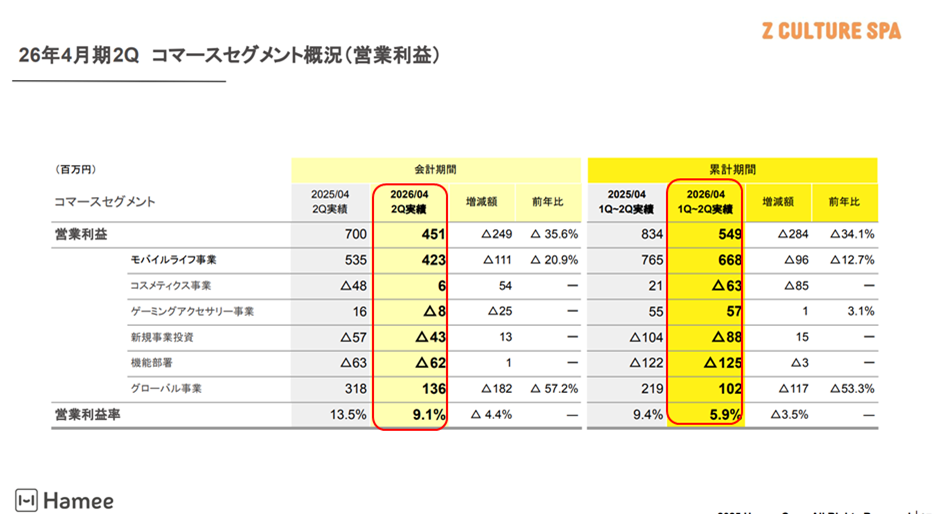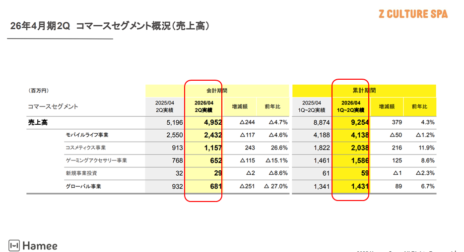 累計では増収減益であったが、四半期別では第1四半期は増収減益、第2四半期は減収減益である。需要環境の変化により厳しめの結果となったが、累計では増収を実現しており、懸案のコスメティクス事業の損益に改善の兆しが見えている。以下、第2四半期についてポイントを整理する。 •モバイルライフ事業:売上高24.3億円、セグメント利益4.2億円(減収減益)。新型iPhone17シリーズ関連商品の販売が当初見込みを下回り、店舗における新型iPhone取り扱い姿勢がトーンダウンした。さらに、EC強化に伴うマーケティング費用が増えた。 •コスメティクス事業:売上高11.5億円、セグメント利益0.06億円(増収黒字化)。1Qに行った卸先再編を経て、秋の新商品およびベースメイク商品のドラッグストア等への卸販売拡大が進んだ。什器・サンプルを含む販促費および物流費・出荷関連コストをこなして黒字化。 •ゲーミングアクセサリー事業:売上高6.5億円、セグメント損失0.08億円(減収赤字化)。モニター市場の供給過多による低価格帯製品の投入が続き、価格競争が発生。 •グローバル事業:売上高6.8億円、セグメント利益1.3億円(減収減益)。米国関税政策の影響が長引き、積極的な販売施策を打てず。