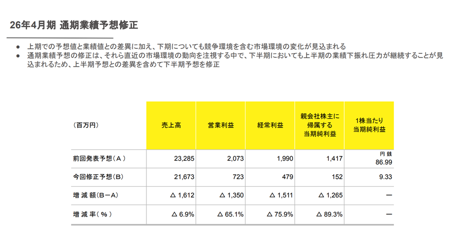 同社は通期業績予想を下方修正した。上期実績の下振れと、下期に対する慎重な見通しを織り込んでいる。