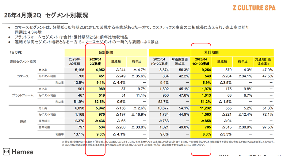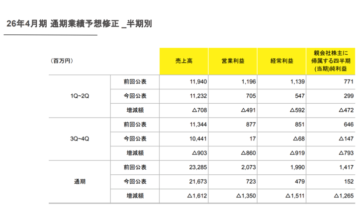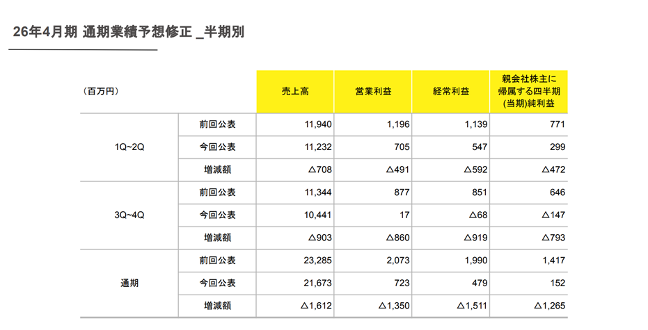 ◇ 2026年4月期第2四半期(中間期)決算ハイライト: