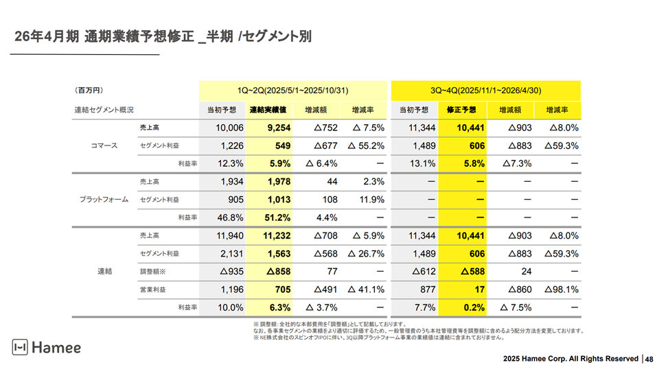 プラットフォームセグメントを担うNE株式会社は2025年11月1日を効力発生日として、2025年11月4日に東京証券取引所グロース市場へのスピンオフ上場を果たし、同社から独立した。今後当社はコマースセグメントを担うため、以下の分析はコマースセグメントに焦点をあてる。