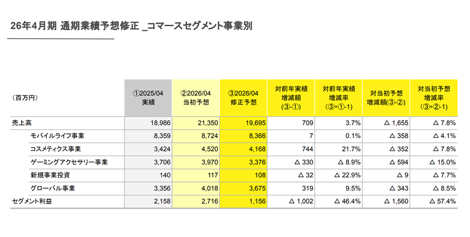 上期の事業環境が下期にも一定程度継続する前提のもと、同社が収益のボトムラインとして想定する水準が示されている。ゲーミングアクセサリー事業の減収見通し(20%減)の影響が大きいものの、コスメティクス事業が増収を続け(33%増)、モバイルライフ事業(微増)、グローバル事業(11%増)も下支える想定で、一定の合理性があると言えるだろう。