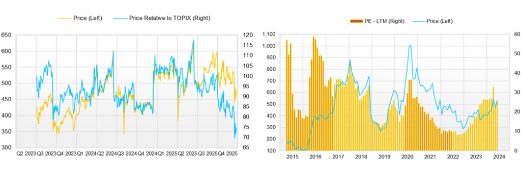 株価はNE社のスピンオフ上場のタイミングにあわせて軟調に推移し、さらに当決算発表を受けて439円まで下落したが、年初来安値(411円)を下回ることなく下げ止まりつつある。