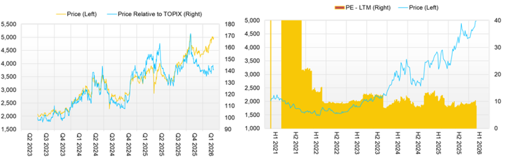 同社の株価は第1四半期決算発表後順調に上昇し10月29日には5220円の年度高値をつけたが、第2四半期決算発表後、4200円台〜4600円台で足場を固める展開になった。その後、第3四半期決算が好調で通期業績予想の達成確度が高まったことから、株価は高値更新をうかがう水準まで上昇している。なお、PBRは1.2倍、予想PERは9.4倍にとどまり、株価に過熱感は乏しい。