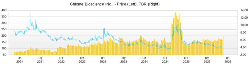 株式会社カイオム・バイオサイエンス(以下、同社)の株式に対する基本スタンスは前回同様「中立からやや強気」を維持する。投資行動としては、導出と共同開発の進展、IDD案件の収益化、バイオシミラー関連の事業進捗といった収益に直結するイベントを見極め株価が調整した局面で段階的に買い進める、イベント連動型が基本。足元の定量指標は時価総額77億円、実績PBR7.04倍、ROE▲64.6%、ROIC▲61.0%、ネットキャッシュ9.43億円、β1.26であり、赤字局面で高PBRが続く構図は変わらない。株価材料が進捗報告にとどまる間は株価の上値が重くなりやすく、バリュエーションレンジが一段上がるには、契約条件や売上と利益への寄与時期が読み取れる開示が欠かせない。