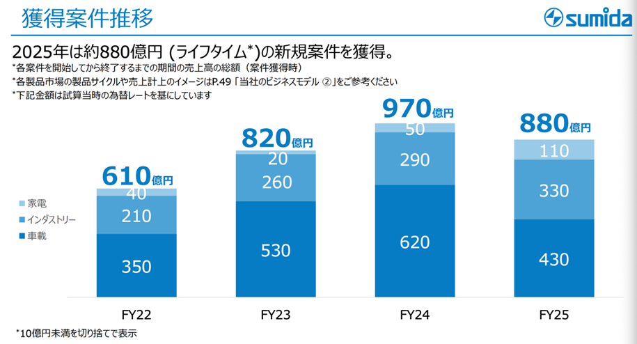 第三に、同社の中長期業績の先行指標となる、獲得案件の金額推移が順調である点だ。2025年12月期は880億円規模の新規案件を獲得している。これは2024年12月期の970億円を下回るものの、2023年12月期820億円よりも大きい。内訳を見ると車載関連の一服をインダストリーと家電の増加で首尾良くカバーできている。