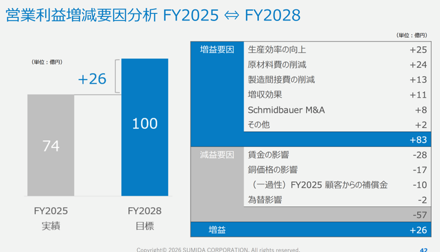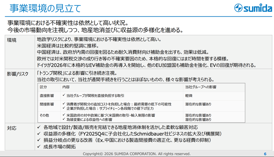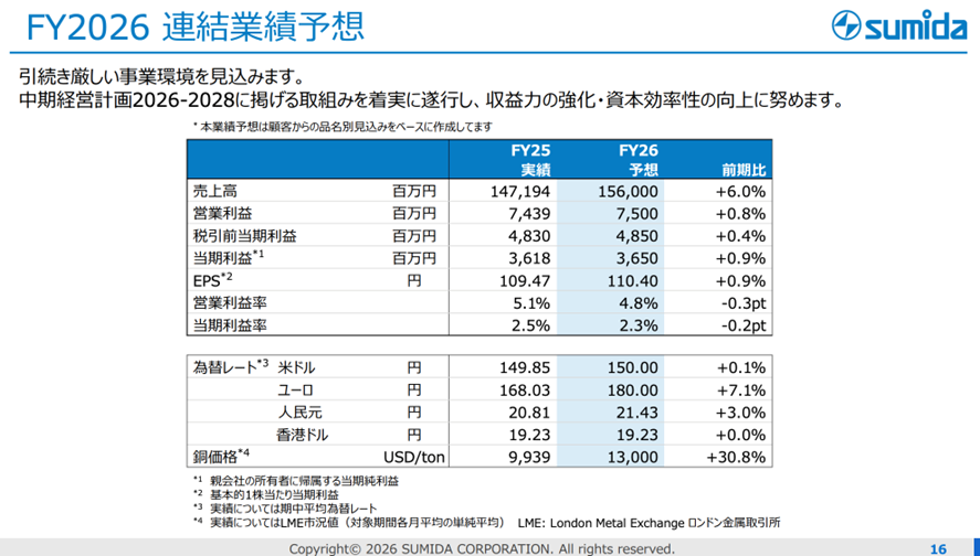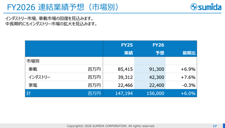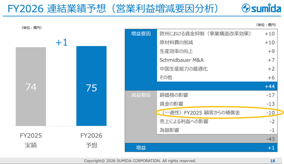 売上収益についてはインダストリー市場、車載市場の回復を見込んでおり、 Schmidbauer社の連結通年寄与も上乗せ要因である。損益面では、増収およびコスト構造改革の効果の継続が期待される一方、銅価格の上昇による原価上昇などのマイナス要因も想定されている。