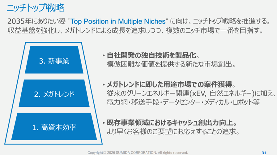 まず長期ビジョンであるVISION to 2035では、同社の強みである技術力・グローバル展開力・用途開発力を活かせる領域が、地球温暖化対応・AI実装・モビリティ革新などによって拡大するという認識に基づき、収益基盤を強化し、メガトレンドによる成長を追求しつつ、複数のニッチ市場で一番を目指すニッチトップ戦略を推進すると表明している。標語は”Top Position in Multiple Niches” である。