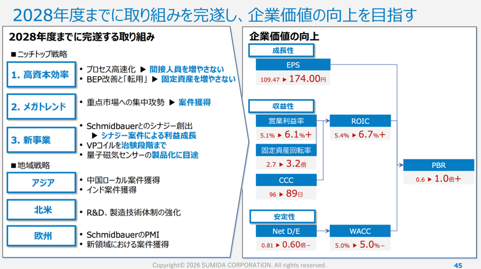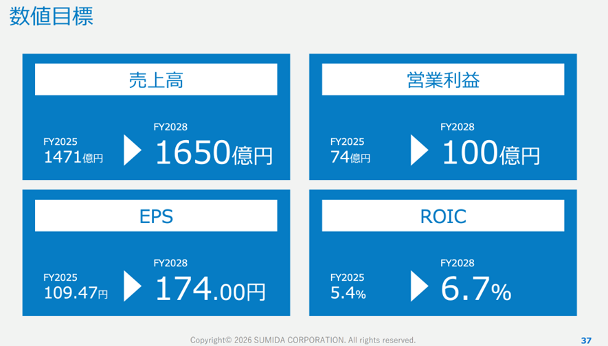 2028年12月期の数値目標は売上収益1650億円、営業利益100億円、EPS174円、ROIC6.7%であり、その骨子は次の通りである。ポイントは、強化された収益力を維持、メガトレンドであるグリーンエネルギー関連・電力網・移送手段・データセンター・医療・ロボット等の案件を獲得、