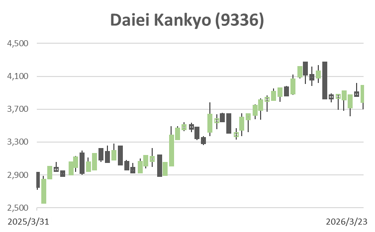 株価は上場後、業績拡大とともに大きく切り上がってきたが、足元で求められているのは、安定成長の確認ではなく、次の成長局面の実証である。27年3月期において、M&Aの通年寄与、価格適正化、土壌処理の高採算成長が営業利益とEPSの双方に明確に表れてくるなら、現在の高評価は維持されうる。現時点では、事業の強さを評価して保有継続とする一方、新規に強気で買い上がるだけのアップサイドは限定的と判断する。