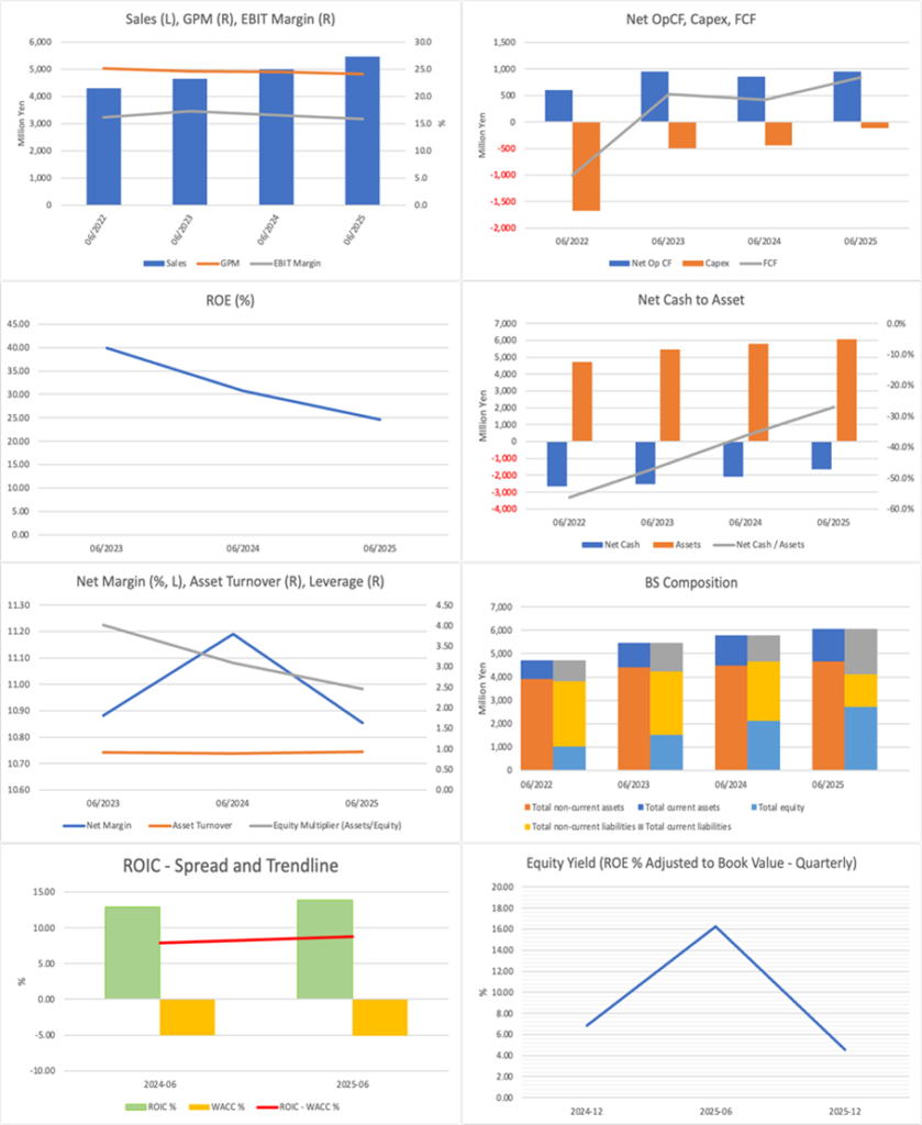 株価は当社推計の適正株価レンジ980〜1,900円の範囲内にあるが、中央値1,430円対比ではすでに上側に位置しており、現時点では上昇局面での利益確定を優先する判断が妥当である。もっとも、この判断は事業の質に対する否定を意味しない。同社は、通常診療から高度医療までを一社内で完結できる体制を有し、その体制が若手獣医師の育成、診療機会の蓄積、評判の向上、さらなるM&A機会の獲得という好循環につながっている。ペットの家族化と医療支出の増加という市場環境も追い風であり、後継者難に直面する個人病院の受け皿としての成長余地も大きい。加えて、足元の業績は強く、FY6/2026中間期は売上・利益ともに大きく伸び、会社は通期予想を上方修正した。高ROEも魅力であり、市場が株価に織り込んでいる長期EPS成長期待も、過去の実績成長率と比べればなお慎重である。