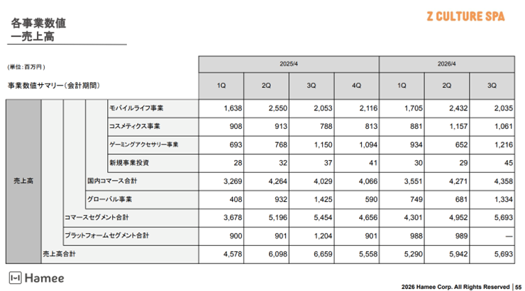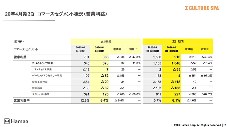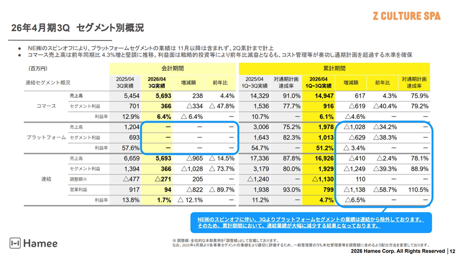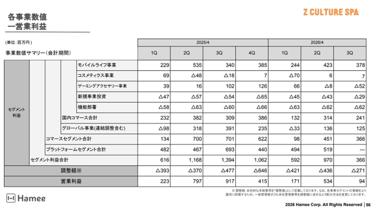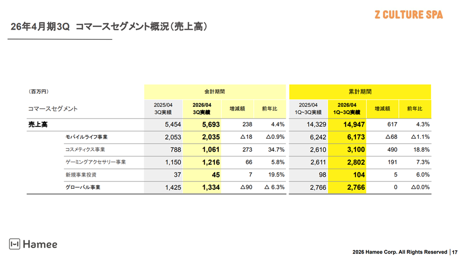 当期中(2025年10月)に実施されたNE社の連結除外の影響が大きいため、同社に残ったコマースセグメントの推移を確認すると、累計期間(5月-1月期)においては売上高149.5億円(同4%増)、セグメント利益9.2億円(同40%減)、会計期間(11月ー1月期)においては売上高56.9億円(同4%増)、セグメント利益3.7億円(同48%減)となった。