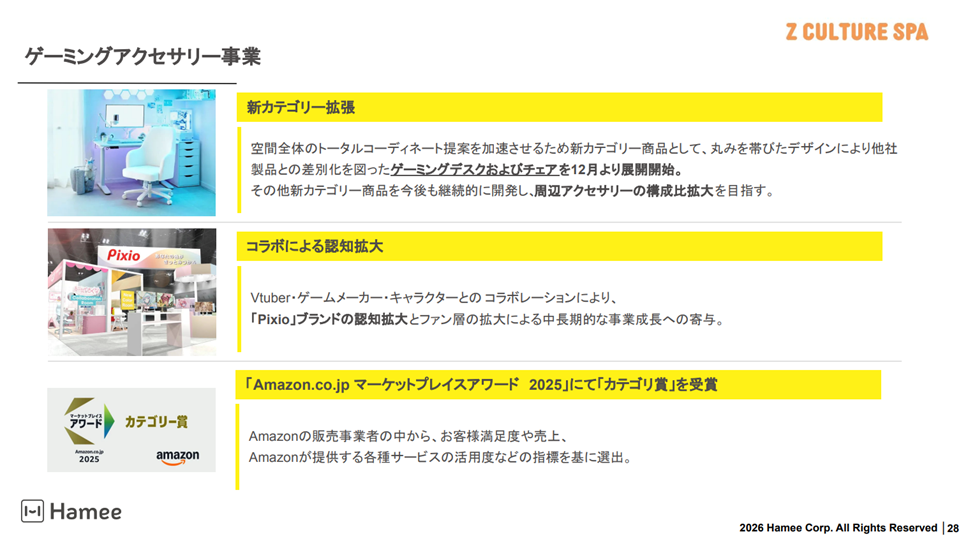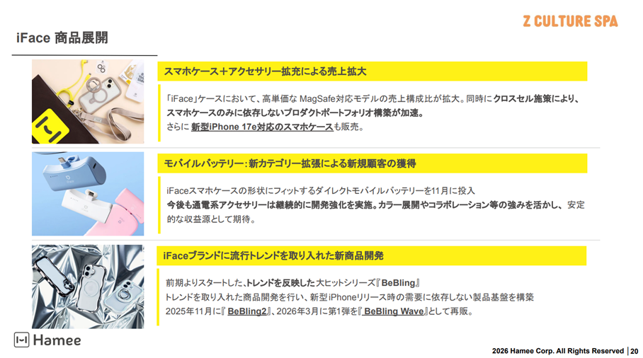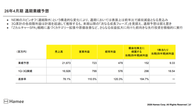 その後、同社は2025年10月末にプラットフォームセグメントを担うNE社をスピンオフし、同年11月に上場させた。以降、同社はコマースセグメントに特化し、Z世代のカルチャーを形にする商品群をSPA機能を活かして多方面に展開すると同時に脱炭素への取り組みを強化する「第三創業期」に入った。2026年4月期決算発表のおいて中長期の計画が示される予定である。