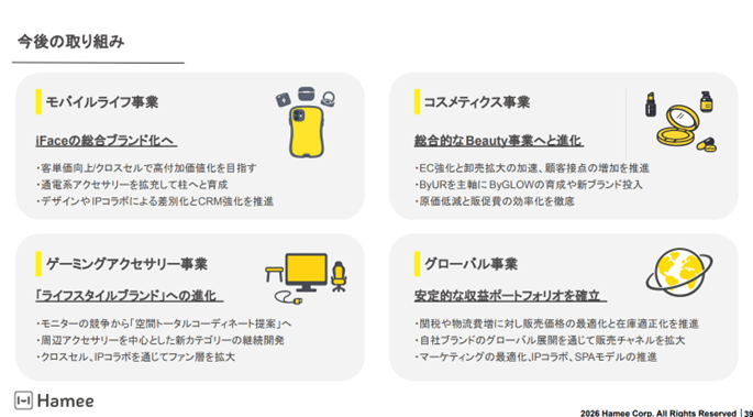 ◇Hamee株式会社(以下、同社)は1997年に創業、2015年に東証マザーズにて株式公開、現在はスタンダード市場に上場。モバイルライフ事業をはじめゲーミングアクセサリー事業、コスメティクス事業、グローバル事業などを展開する「コマースセグメント」と、インターネット通販事業者向けにネットショップ運営にかかわる業務を自動化しモール横断型で複数店舗の受注処理や在庫状況を一元管理できるクラウド(SaaS)型のECAttractions“ネクストエンジン”を提供することを主とする「プラットフォームセグメント」の二つのセグメントを分社化して運営してきた。