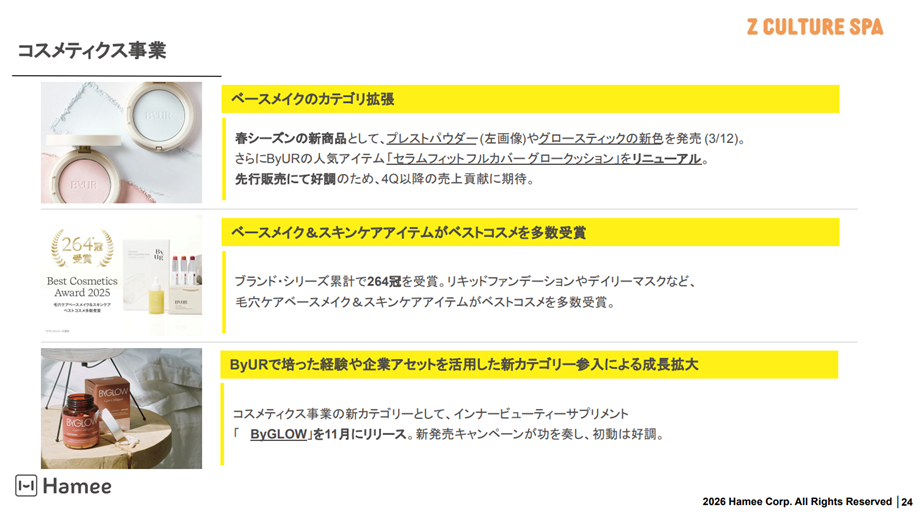 2. コスメティクス事業が先行投資期を卒業し、どのタイミングで本格的な収益化フェーズに入るのか。